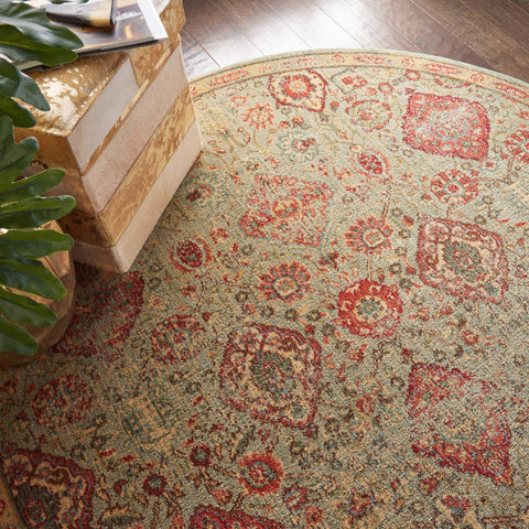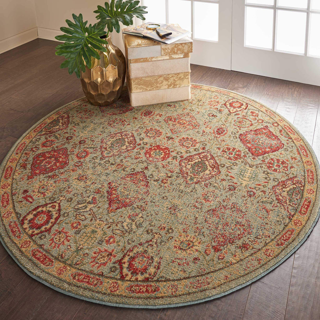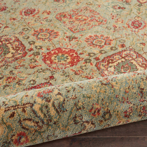 Details: Sophisticated color and incomparable texture define this unique collection of high-fashion accent and area rugs. Each rug is made exclusively from Nourtex's unique Opulon™ fiber on state-of-the-art Wilton looms for superlative softness and durability. A wealth of fashion-forward color palettes warmly are enhanced by a shaded abrash effect that evokes the vintage appeal of the finest handmade carpets. Subtle accents of hand carving impart an elegant sense of dimension to the feature elements of each signature design. Deeply distressed patterns on a pale green field give this Somerset Collection rug an unmistakable elegance and Old World allure. Traditional designs in red and gold are surrounded with an ornate border, with a look and feel of ancient Persian rugs. The perfect exotic accent for any room, woven from easy-care fibers for exceptional quality and durability.