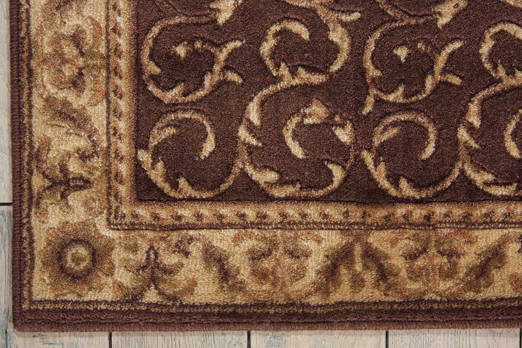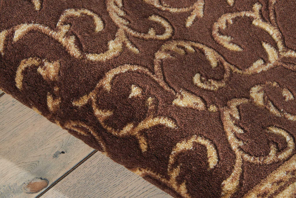 Details: Sophisticated color and incomparable texture define this unique collection of high-fashion accent and area rugs. Each rug is made exclusively from Nourtex’s unique Opulon™ fiber on state-of-the-art Wilton looms for superlative softness and durability. A wealth of fashion-forward color palettes warmly are enhanced by a shaded abrash effect that evokes the vintage appeal of the finest handmade carpets. Subtle accents of hand carving impart an elegant sense of dimension to the feature elements of each signature design. Leaves, vines and botanicals gracefully entwine in this sophisticated study of rich chocolate brown and camel with delicate olive accents. This plush pile rug is furnished with a fabulous sheen for exceptional tone and detail.