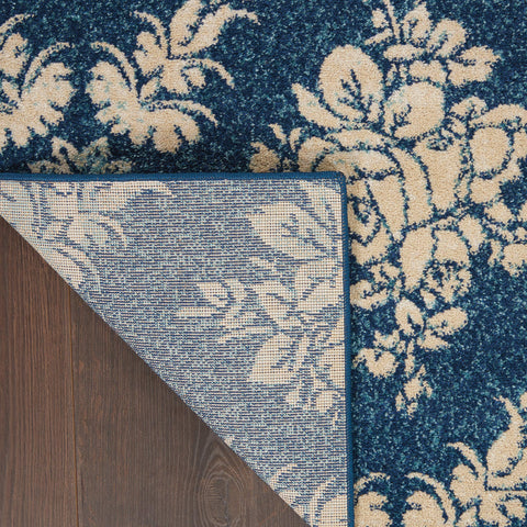 Details: The simple elegance of French Country design comes home in this charming repeat-pattern area rug from the Tranquil Collection. A floral lattice surrounds lush botanical swags on an abrash navy blue field, creating a vintage look that’s enhanced by the ombre sky blue designs.