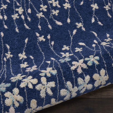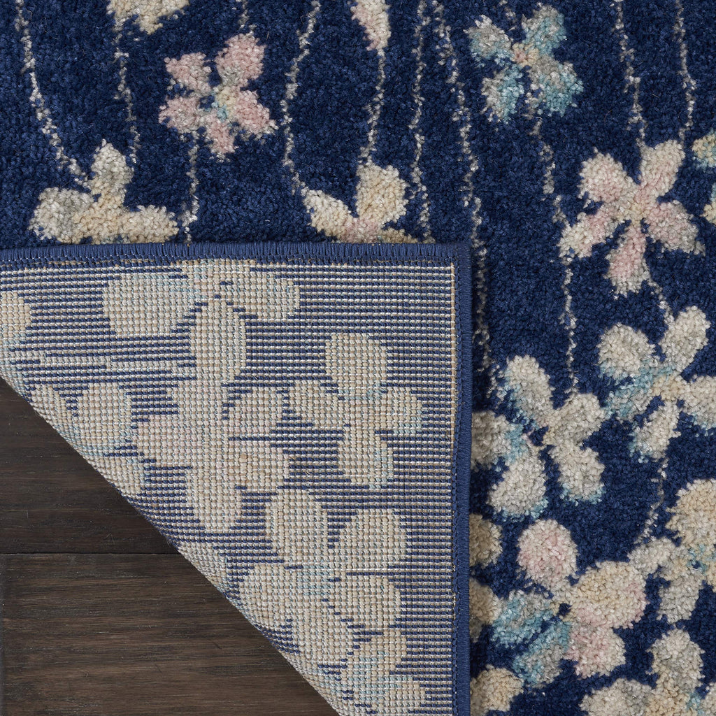 Details: Delicate flowers blow on a gentle breeze in this delightful botanical rug from the Tranquil Collection. Watercolor tones of pink and blue on a navy field create a marvelous sense of softness to bring a boho look to your unique decorating style.