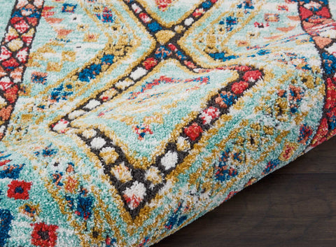 - Multicolored tribal designs on an abrash aqua ground