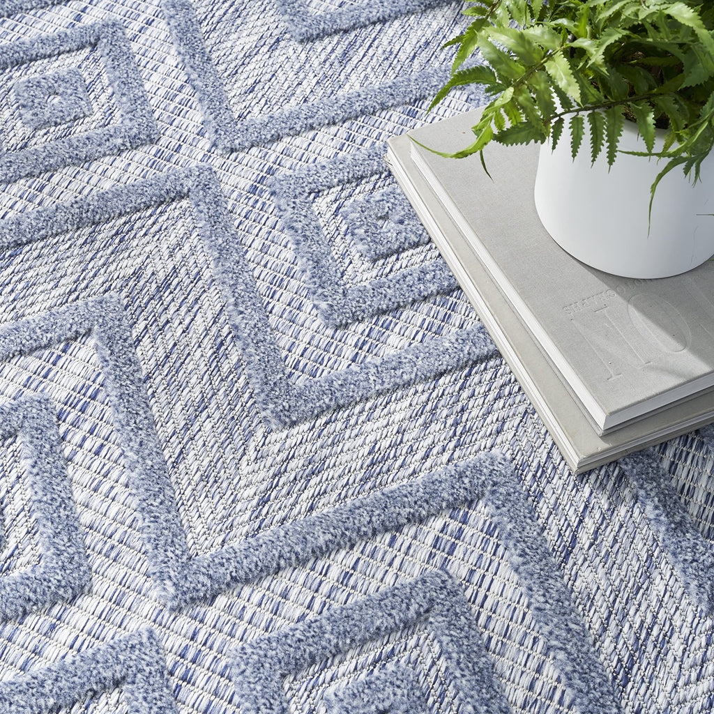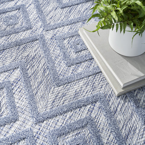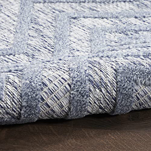 Details: Enhance your indoor or outdoor space with the contemporary appeal of an outdoor rug from the Nourison Versatile Collection. These dynamically textured rugs feature a flatwoven ground with raised designs that feel incredibly soft to the touch, adding an instant layer of depth to just about any space – from living room and dining room to patio, porch, or deck. Machine-made from a blend of durable polypropylene and polyester fibers that are easy to clean: just hose rinse and air dry. This denim blue Nourison Versatile Collection rug brings inviting style to your favorite indoor or outdoor space. With a raised diamond design in that stands out beautifully against its flatwoven ground, this outdoor rug enhances your space with delightful texture and modern appeal. Machine-made from durable, easy-to-clean fibers, Versatile is great for high-traffic areas inside the home as well as all seasons spent outdoors.