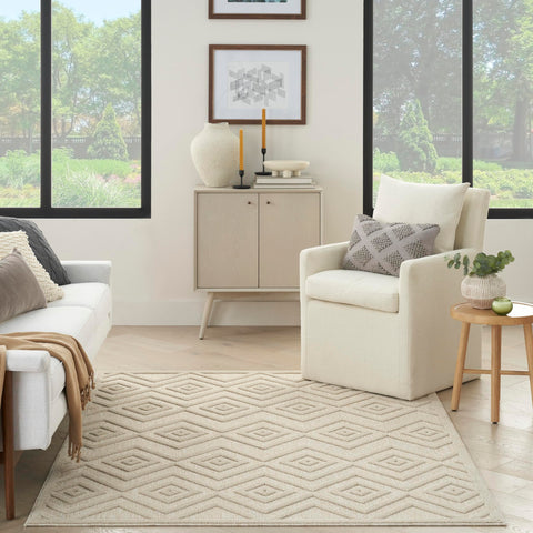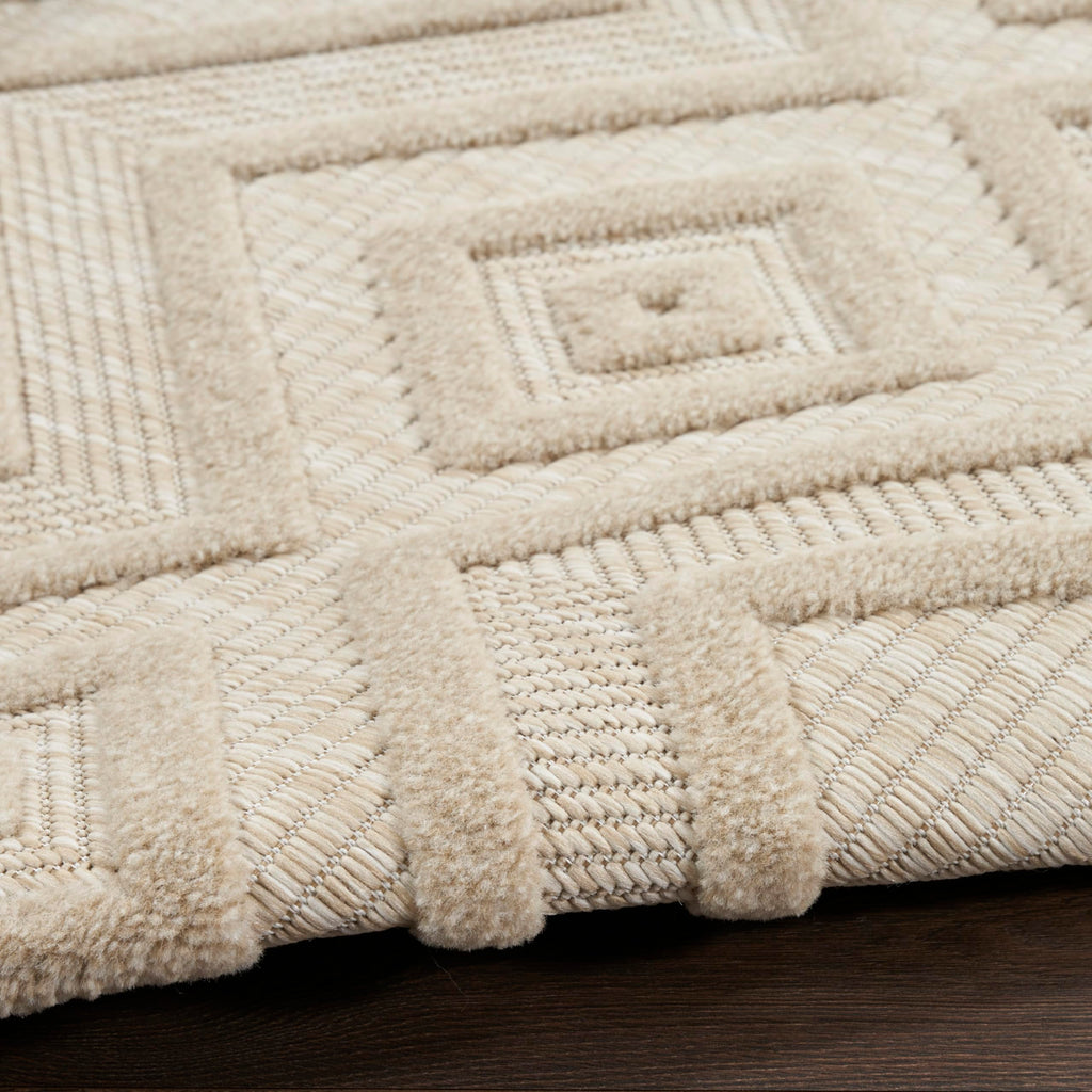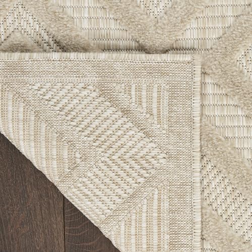 Details: Enhance your indoor or outdoor space with the contemporary appeal of an outdoor rug from the Nourison Versatile Collection. These dynamically textured rugs feature a flatwoven ground with raised designs that feel incredibly soft to the touch, adding an instant layer of depth to just about any space – from living room and dining room to patio, porch, or deck. Machine-made from a blend of durable polypropylene and polyester fibers that are easy to clean: just hose rinse and air dry. This Nourison Versatile Collection rug brings inviting style to your favorite indoor or outdoor space. With a raised diamond design in earthy cream tones that stands out beautifully against its flatwoven ground, this outdoor rug enhances your space with delightful texture and modern appeal. Machine-made from durable, easy-to-clean fibers, Versatile is great for high-traffic areas inside the home as well as all seasons spent outdoors.