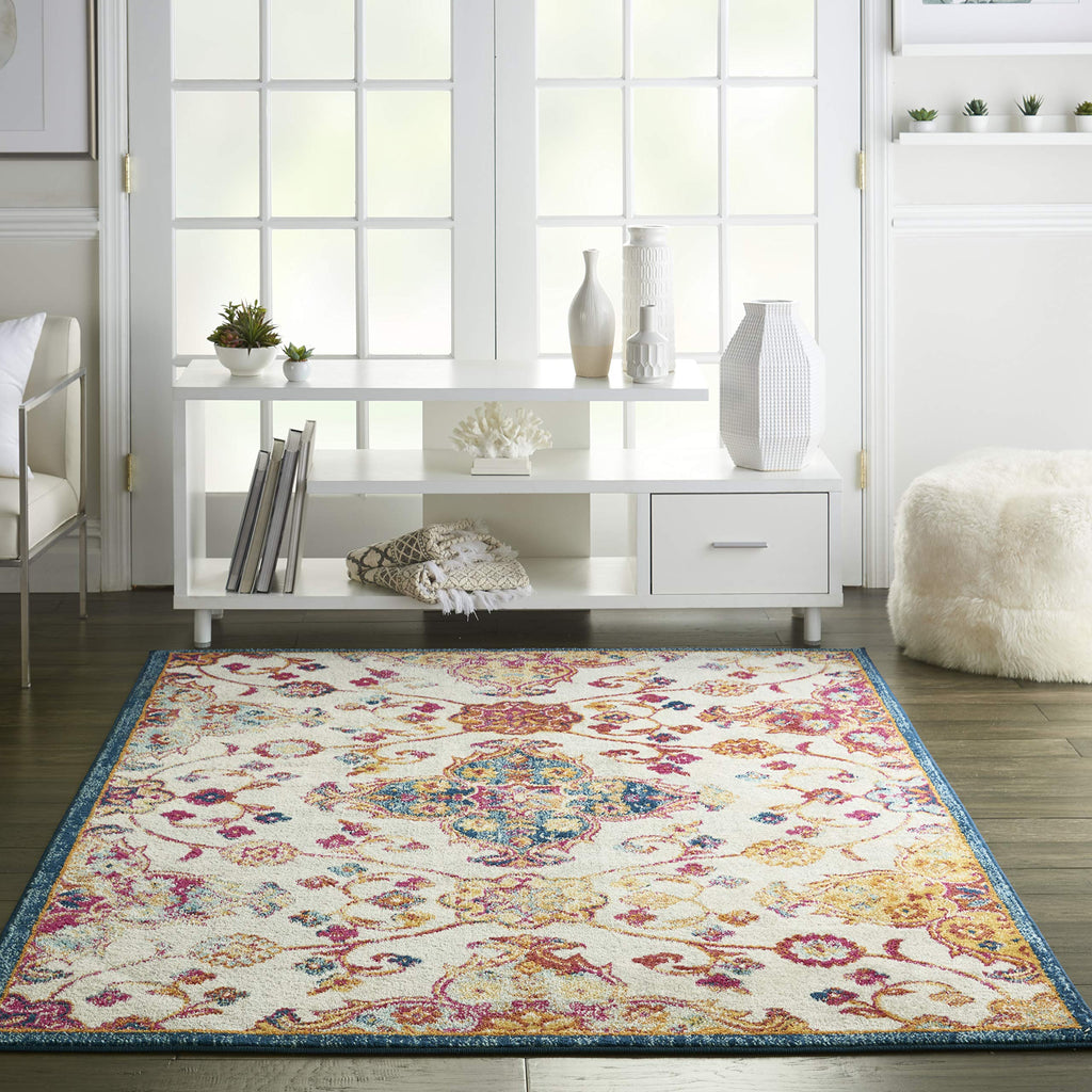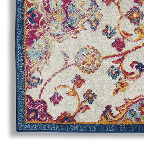 Details: The classic elements of Persian rug design are updated for a new generation in the Persian Vintage collection. The traditional floral motifs, once meant to portray a royal Moghul courtyard garden, now bring a garden of beauty into the modern home. Rich in detail, these lovely, low-pile rugs offer the simplicity of easy-care fibers in 100% polypropylene. The fresh color palettes, gently faded for vintage effect, work perfectly in classic or contemporary decor. With serged edge for a clean finishing touch. Elegant arabesques of flower-bearing vines twirl in sinuous beauty across this Persian Vintage area rug. The center medallion and entire design glimmers with jewel multi-color tones on an ivory ground. Made of easy-care fibers for the modern lifestyle.