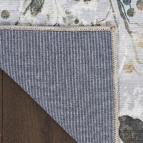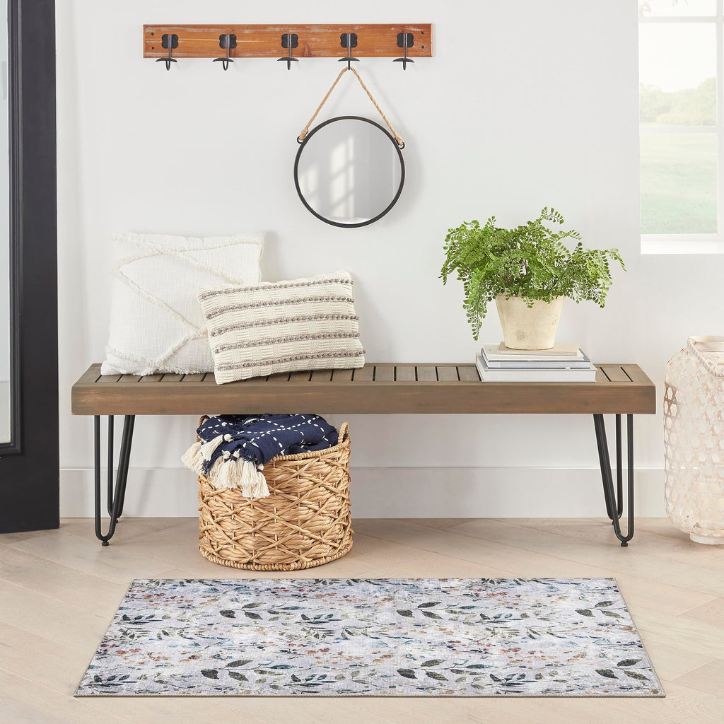 Details: The Nourison Washables rug collection is a practical and stylish addition to any home. Each design is made with a recycled cotton non-slip back for added peace of mind, especially in areas prone to trip hazards. Choose from a variety of chic designs, including abstract, geometric, animal print, and floral rugs to effortlessly elevate your décor. Machine-made from poly-cotton blended fibers in a flat weave style. Add a touch of artistic elegance to your home with this grey Nourison Washables floral rug. This rug features a beautiful floral silhouette design in a soft watercolor style, creating a serene and calming atmosphere in any space. Made from durable materials, this rug is easy to clean and includes a non-slip backing for added safety.