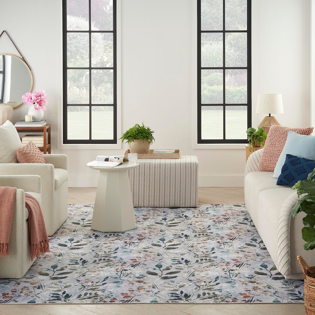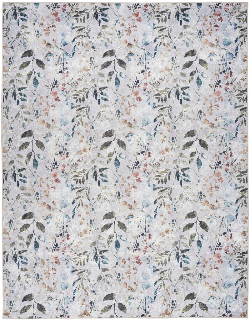 Details: The Nourison Washables rug collection is a practical and stylish addition to any home. Each design is made with a recycled cotton non-slip back for added peace of mind, especially in areas prone to trip hazards. Choose from a variety of chic designs, including abstract, geometric, animal print, and floral rugs to effortlessly elevate your décor. Machine-made from poly-cotton blended fibers in a flat weave style. Add a touch of artistic elegance to your home with this grey Nourison Washables floral rug. This rug features a beautiful floral silhouette design in a soft watercolor style, creating a serene and calming atmosphere in any space. Made from durable materials, this rug is easy to clean and includes a non-slip backing for added safety.