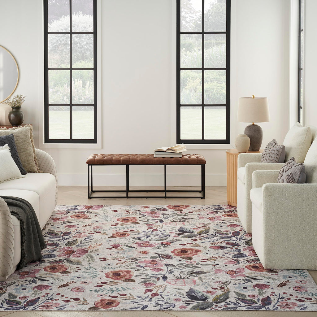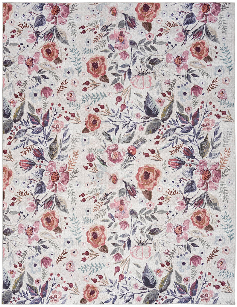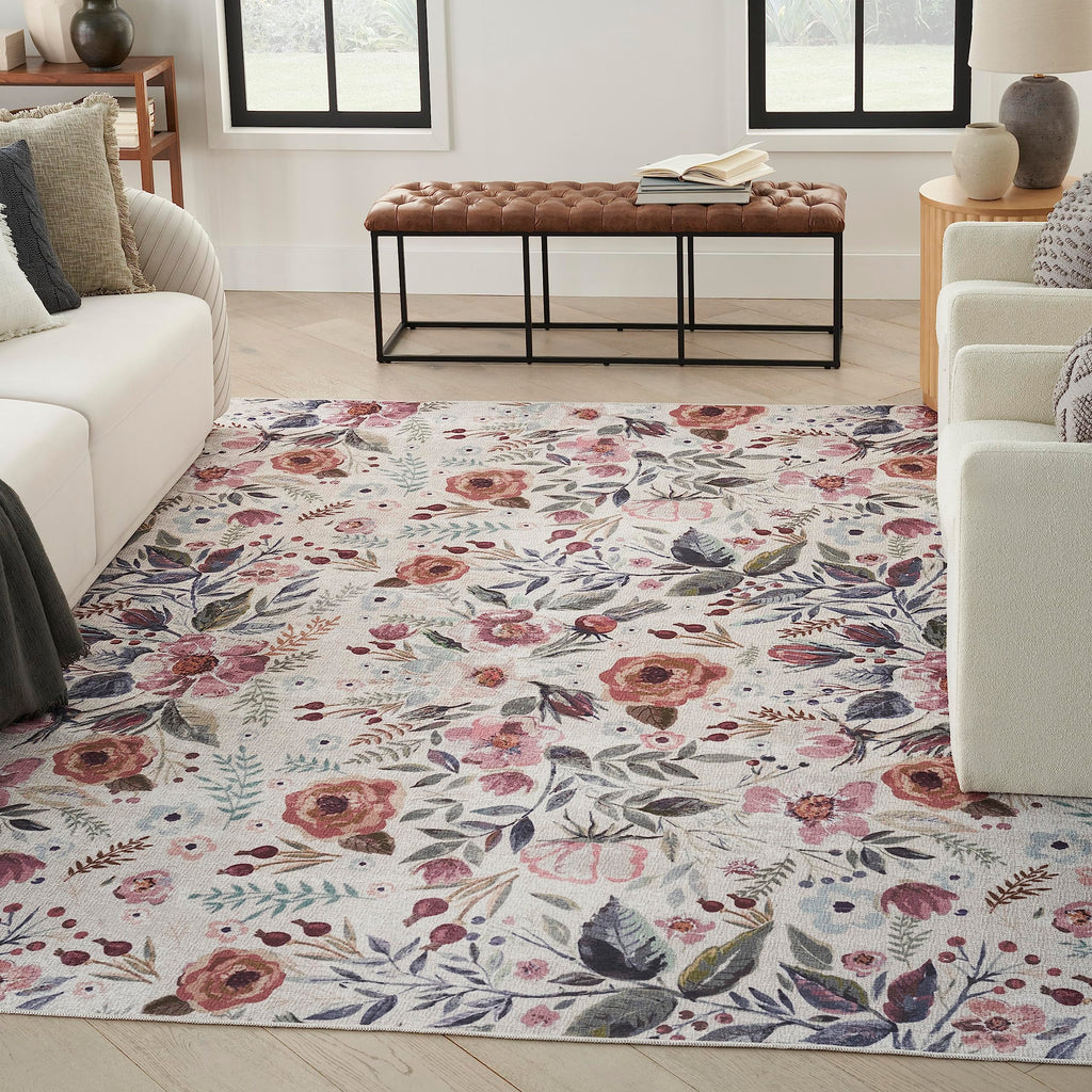 Details: The Nourison Washables rug collection is a practical and stylish addition to any home. Each design is made with a recycled cotton non-slip back for added peace of mind, especially in areas prone to trip hazards. Choose from a variety of chic designs, including abstract, geometric, animal print, and floral rugs to effortlessly elevate your décor. Machine-made from poly-cotton blended fibers in a flat weave style. Add vintage charm to your home with this pink and ivory Nourison Washables floral rug. The oversized watercolor-inspired pattern channels a farmhouse vibe, making it perfect for adding warmth to any space. Made from durable materials, this washable rug features a non-slip backing for added safety on hard floors.