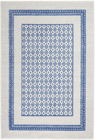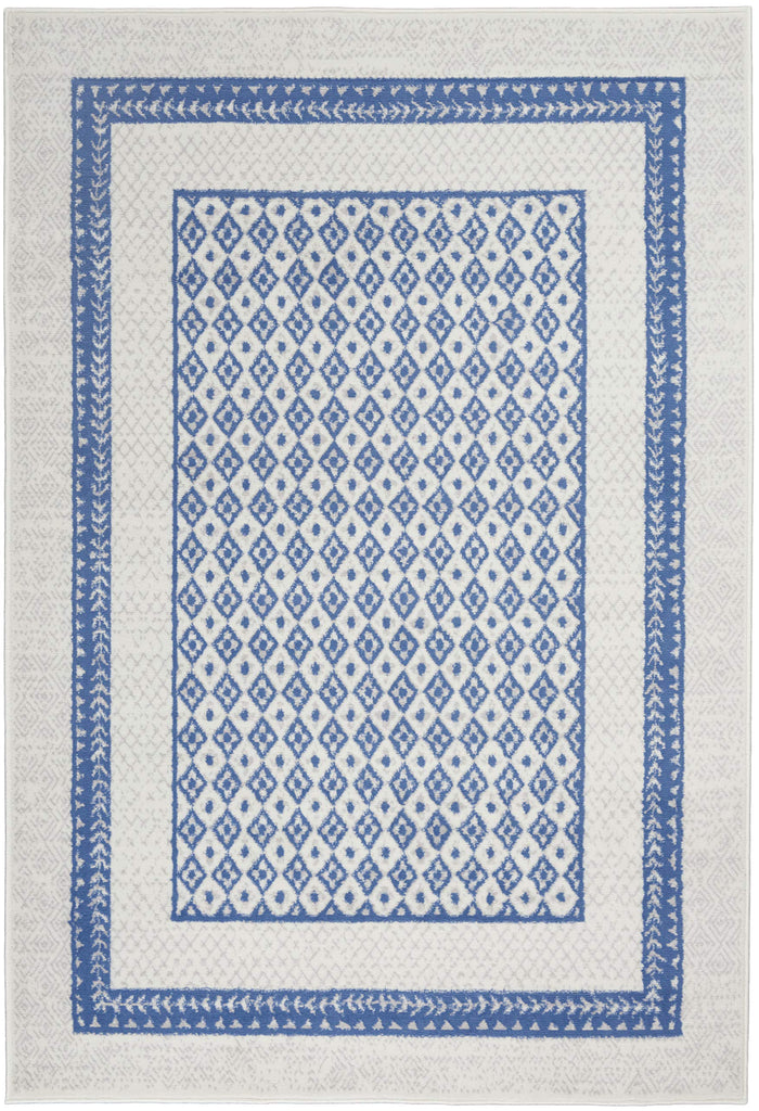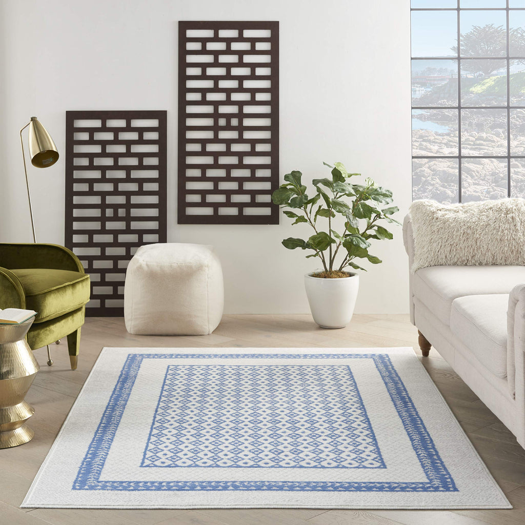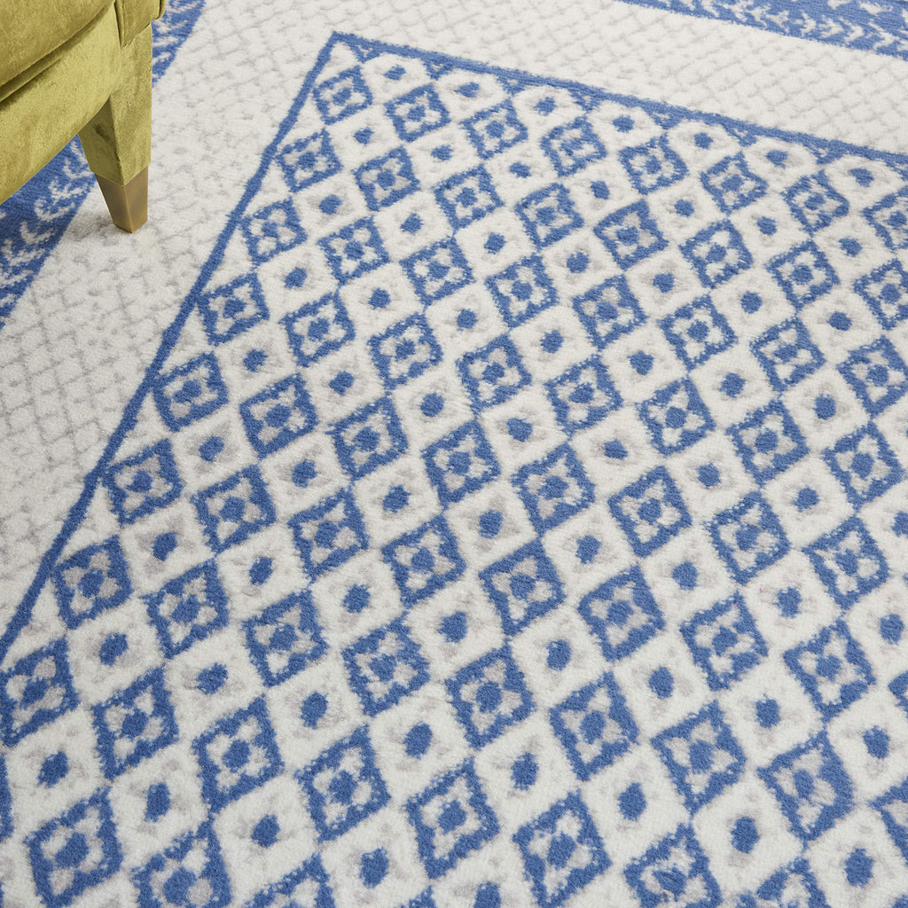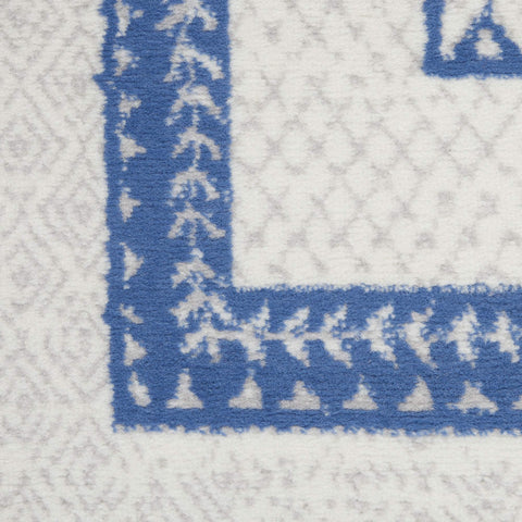 Details: In true bohemian style, the Whimsicle Collection boasts an eclectic mix of tribal inspired, geometric, and classic floral motifs. Purposefully distressed vintage patinas in neutral, of-the-moment palettes make any Whimsicle Collection rug a versatile foundation for any style of decor. These expertly crafted low-profile area rugs are machine made of soft polyester for a seamless fit in your living room, bedroom, dining room, or home office. With its simple geometric patterns and double border, this Whimsicle Collection area rug brings an eclectic vibe to your surroundings. A neutral palette of ivory, blue, and grey with distressed accents add a softly antiquated finish to bohemian decor. Machine made of soft polyester with a low profile for a seamless fit under your sofa, dining room table, or near areas that need door clearance.